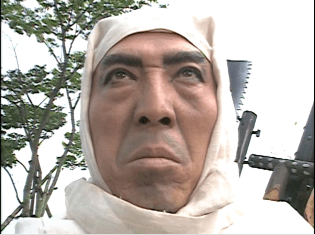 Abumaru’s meddling in the computer creates a time slip that brings legendary Japanese warrior Musashibo Benkei (played by Ultraman Jack’s suit actor Eiichi Kikuchi) into the modern age, with Khan intending to have the monk act as Takeshi’s bodyguard. Benkei has some trouble adjusting to modern times, especially when Khan and Abumaru somehow manage to cause the guy to go berserk and cause havoc (intended to be a test run for when Khan decides to bring dinosaurs into modern day Japan).