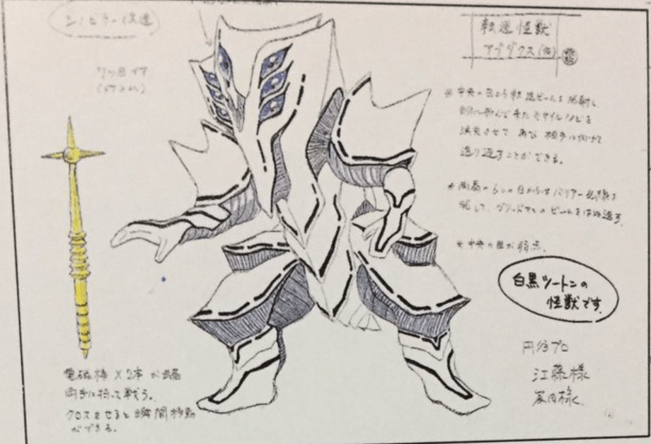 On the subject of Shinobilar, the costume itself was a remodeling of Kung-Fu Shinobilar, and originally had a different idea for his design that wasn’t as streamlined. While I do love the final Abumaru, I feel like this one would’ve been a real cool monster to see realized in suit form. The name Abumaru derives from the word abduction, and the monster’s original name was Abdax.