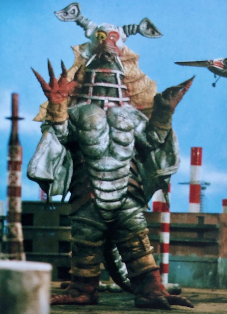 Antigone’s first monster, born from a lizard that he transforms with his staff, King Jaiglass is the one who kills Captain Tachibana during his initial rampage. Jaiglass is a pretty standard saurian monster, but he’s far from a terrible one, and sometimes you just have to kick things off with a big dinosaur. I really like his long arms and golden crest he’s got on his head. Designed by Yonetani, Jaiglass had the very generic name of Lizard King early on in production until Yonetani himself objected and it was changed. The design was meant to convey that Jaiglass was a cybernetic creature with the golden crest he has, representing the lack of life the creature now has. The crest was supposedly very heavy, so the monster was given long arms to help give the suit actor enough balance to preform.