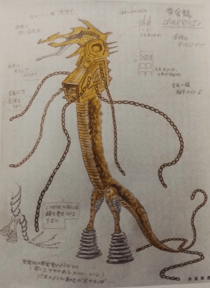 The original design of Gold Dragon was meant to be a homage to Ultraseven‘s Nurse, but the design by Yonetani would be scrapped and replaced ultimately with a design by Kengo Kime. I gotta say, while I’ve enjoyed the tributes to the various Ultraman kaiju, I am glad we got the final design, which looks a lot more unique and able to stand on it’s own as a character. In addition, while I presume Yonetani’s version of Gold Dragon would be a puppet as well, it looks like it’d be a bit more elaborate and harder to pull off compared to it’s inspiration and the final design.