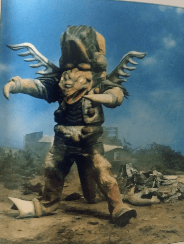 Butterfly King is one of those monsters who is much scarier in their human disguise as opposed to it’s true form, which sadly looks really cheap with those huge wings and orange bell bottoms. The suit itself was based off of Yonetani’s original design for the Growth aliens, which probably is the reason for the more slapdash nature of the design.