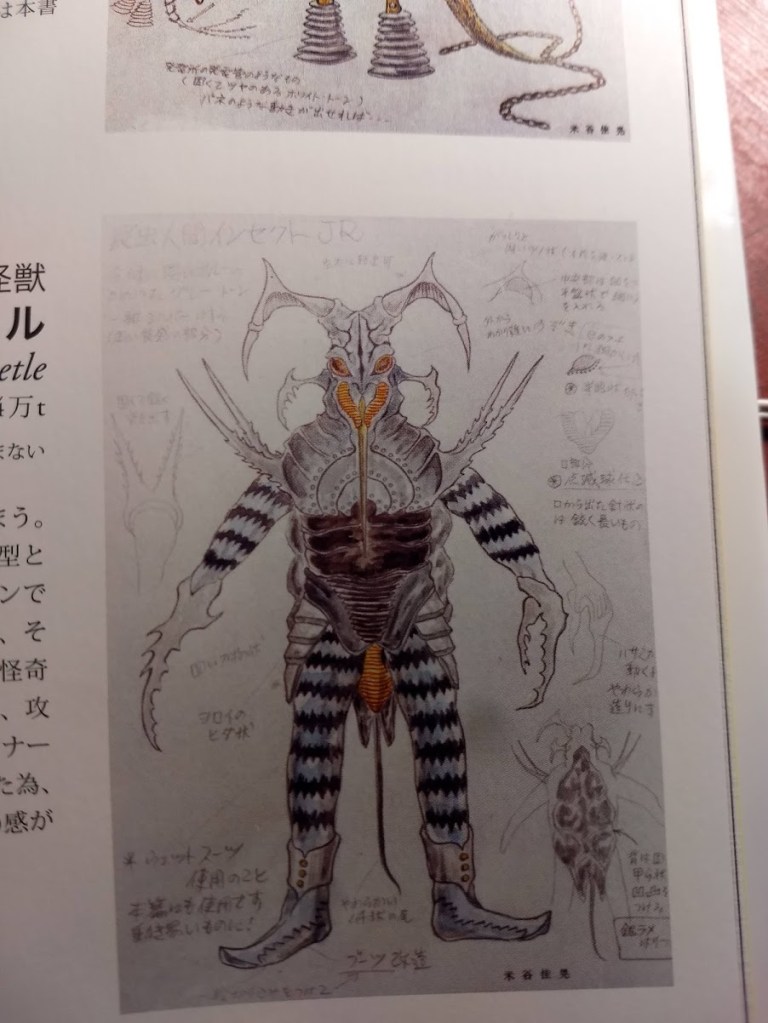 It’s not a bad Baltan pastiche either, and I can totally see this guy appearing as a variant of everyone’s favorite space ninja in an Ultra show at the time. The original design by Yonetani even has the striped pattern Baltan has! King Beetle’s vine-shaped tentacles were added on during the construction of the suit and weren’t part of Yonetani’s original conception for the character.