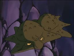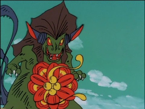You see, unlike his live-action cousin, Death Balun feeds off of human beings, keeping them in a secret, underground ruin where they’re subjected to a hallucinogenic pollen until Balun needs a snack! It’s fairly horrific concept for a kaiju with a big flower on his belly.