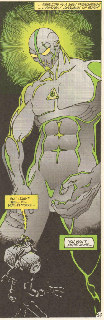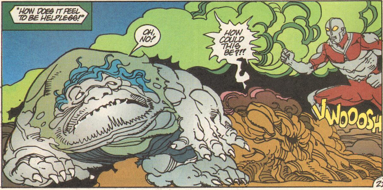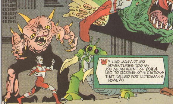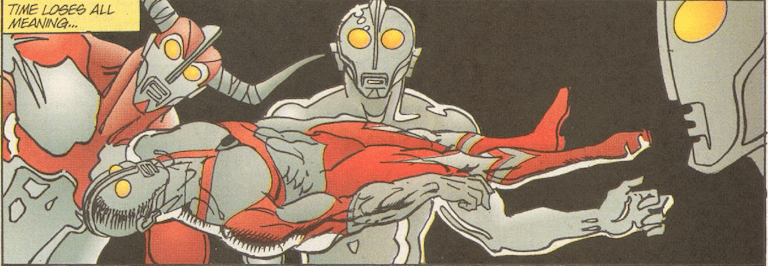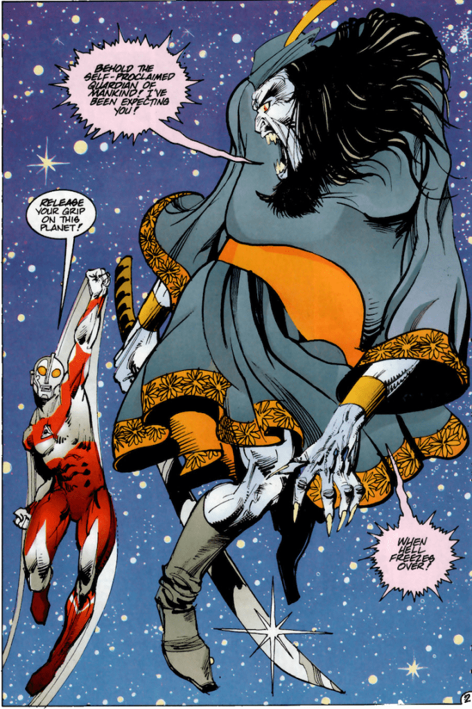 The villain of the Ultraman Negative One special by Nemesis, this unnamed demon character (who I’m just gonna refer to as Demon Guy for simplicity’s sake), is born from the universe’s darkness, and his manifestation causes natural disasters, plagues, famine and even causes his darkness to shroud the planet. Great shows up, but Demon Guy is too strong and traps him. Jack Shindo and the martial arts master Ace Kimura steal a UMA aircraft and Jack flies it straight into Demon Guy, freeing Great and allowing him to vanquish him, releasing Earth from his hold. Great then fuses with Ace, who then serves as Great’s host for the remainder of the comics.