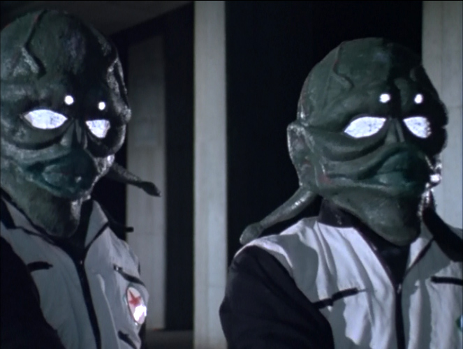 After staying late after school working on papers, poor Takeshi boards the wrong train and finds himself in a bizarre dimension. This is the base of operation of the Bam, a race of aliens seeking to conquer the Earth with their robot kaiju, Mechagiras. The Bam themselves aren’t as elegant as some of our previous alien invaders, but they’re not bad looking, reminding me very much of something one would see in the original Star Trek series.