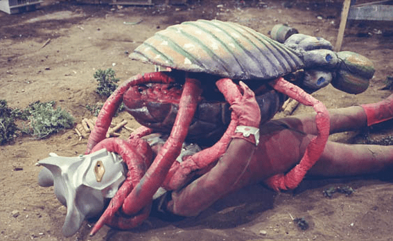 Demos’s design is based off of the brittle star, a close cousin to the starfish and a creature I’m surprised isn’t used more often as a basis for a kaiju. It’s a pretty good looking monster, that does look like the kind of thing that’d feast on human blood, and the goofy, bugged-out eyes and circular mouth are ridiculous enough to make Demos feel more obscene. Can you imagine being drained of all your blood while this thing is making a silly face at you? It swings around from being funny to something out of a nightmare.